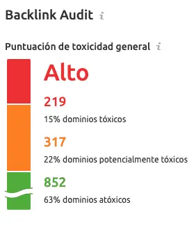 Ahora que has revisado todos los enlaces, es hora de detectar enlaces tóxicos. Para ello, hay que revisar la puntación de toxicidad que proporcionan las diferentes herramientas. La puntuación de toxicidad de un sitio otorga una media en base al porcentaje de enlaces tóxicos, potencialmente tóxicos y atóxicos de un sitio web.