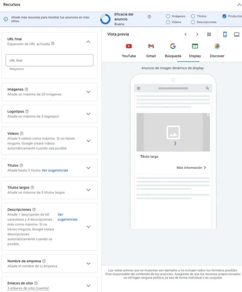 - Los anuncios pueden publicarse en un gran abanico de inventario; YouTube, la Red de Display, la Red de Búsqueda, Discover, Gmail y Maps.