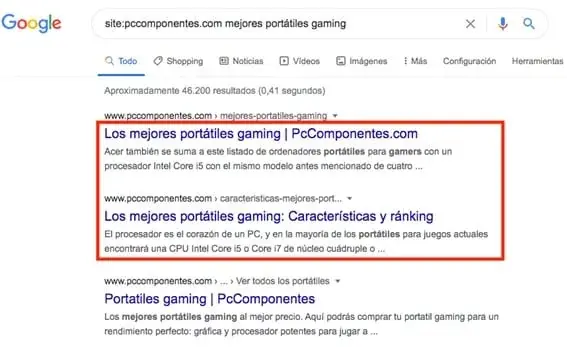Si realizas una búsqueda en Google con el comando site:tudominio.com “keyword de búsqueda” verás todas las páginas que contienen ese término. Una vez detectadas, deberás de operar del mismo modo comentado en el punto anterior. Es decir, agrupando aquellos resultados que puedan dar resultado a esa misma intención de búsqueda.