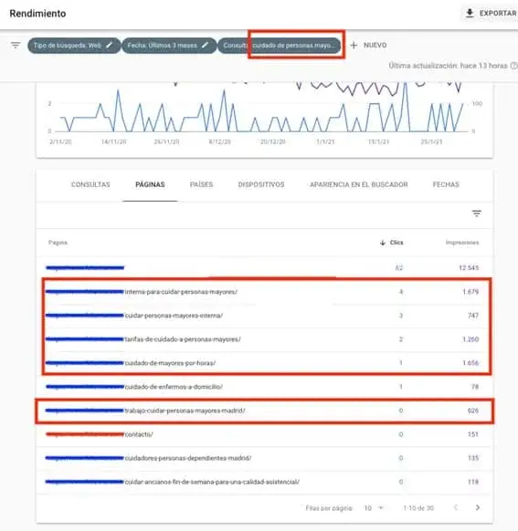 Si realizamos una búsqueda por término con la herramienta de Search Console podremos detectar cuántas páginas están dando visibilidad a ese mismo término. Para ello haremos entraremos en el apartado de “Rendimiento” y aplicaremos un nuevo filtro de tipo “término” en el que incluiremos la keyword a analizar. Tras el listado obtenido clicaremos sobre la pestaña “Páginas” y así obtendremos el listado de páginas que se están posicionado para ese término de búsqueda.