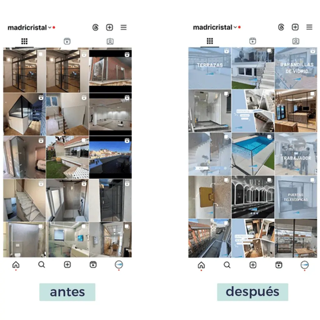 - Creación de una identidad consolidada: Diseñamos un feed atractivo, alineado con la calidad y profesionalidad de la marca, utilizando imágenes cuidadas de creación propia y contenido relevante sobre el sector de la cristalería y vidrio, para usuarios interesados en interiorismo y soluciones en vidrio para su hogar o negocio.