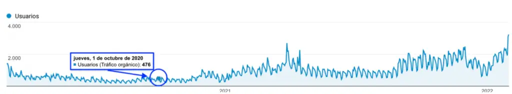 Desde que dio comienzo la estrategia SEO,la web de IFSES continua con un proceso de aumento de tráfico orgánico de forma constante aumentando en un +287,90% el número de usuarios orgánicos en comparación con la fecha de inicio del proyecto hasta inicio del año 2022.
