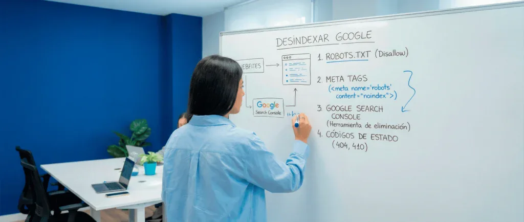 Desindexar significa eliminar una página web del índice de Google para que no aparezca en los resultados de búsqueda. Esto no borra la página del servidor, solo impide que los buscadores la muestren públicamente.