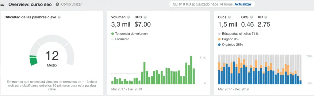 De esta herramienta es muy interesante obtener el nivel de dificultad y la cantidad de clics en los resultados de búsqueda para una palabra clave.