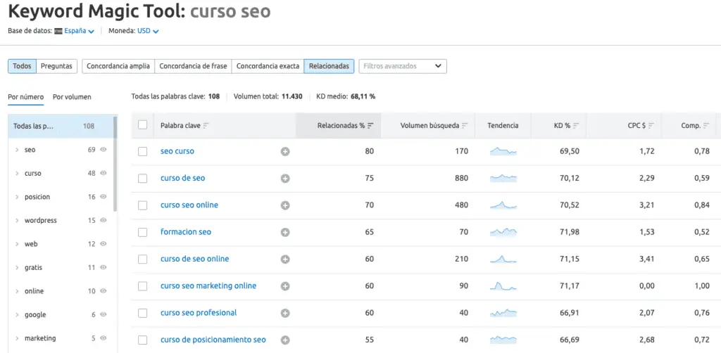Semrush permite realizar búsquedas en función de la concordancia, ya sea amplia, de frase y exacta. A su vez, también permite detectar palabras clave en base a preguntas y palabras clave relacionadas. Muestra los datos del volumen de búsquedas mensuales, la dificultad y la tendencia.