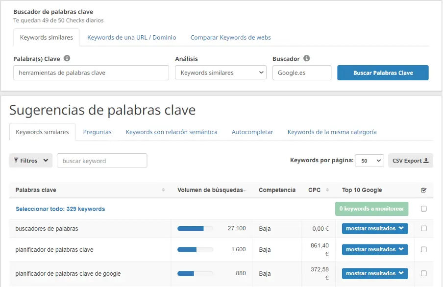 La ventaja de esta herramienta es que proporciona muchas ideas y es muy buena para sacar long tail interesantes. Además, toda la información se puede exportar.