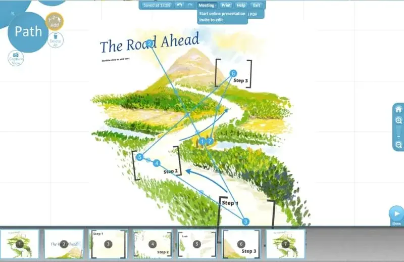 Junto con Canva también es una de las más populares. Algo más complicada de manejar al principio, pero que dará un resultado muy dinámico a tus presentaciones. Su principal diferencia y característica es que se considera una herramienta narrativa. No funciona por diapositivas, se crea mediante un lienzo infinito y ordenado, parecido a un mapa mental. Se distingue por su diseño con zoom que amplia y reduce el cuadro de información.