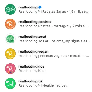 Ejemplo de ello es la cuenta de consejos de nutrición realfooding. Con su cuenta principal @realfooding y sus cuentas secundarias enfocadas a postres, para llevar, recetas veganas, para niños y la versión inglesa.