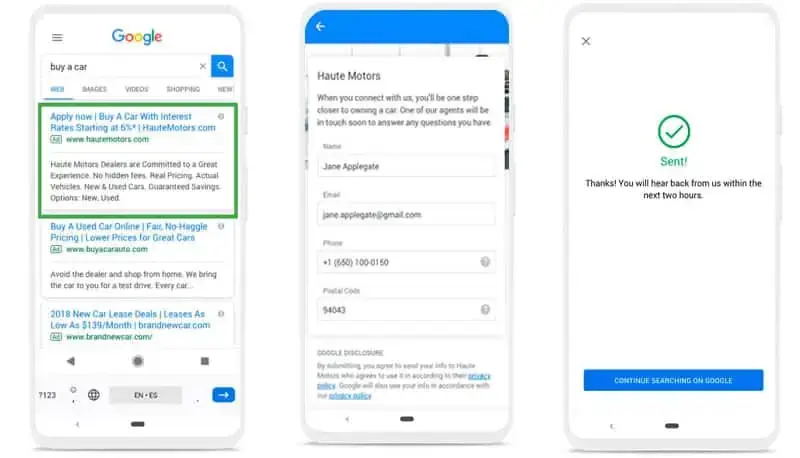 Ahora mismo está en beta para algunas cuentas la posibilidad de añadir una extensión de Generación de leads a los anuncios que aparecen directamente entre los resultados de búsqueda.