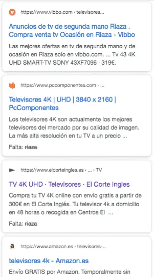 Analizando un poco más exhaustivamente, también detectamos que existe una correlación entre el Título de la Página, el H1 y la consulta realizada. Esto ocurría con keywords más generales y con volumen de búsqueda elevado. Por el contrario, no ocurría lo mismo para otras búsquedas más locales con keywords de long tail. Hicimos la comprobación con los términos de búsqueda “Comprar Televisores 4k en Riaza” y descubrimos que las páginas mostradas no tenían estas keywords de forma específica y por lo tanto en sus resultados la imagen thumbnail no se mostraba en los resultados.