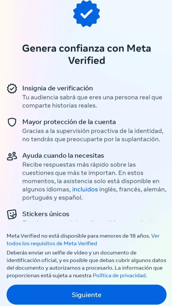 De acuerdo con su página web, Meta Verified es «una suscripción de pago para perfiles aptos con el objetivo de establecer su presencia en Instagram y Facebook. Esta suscripción incluye ventajas que solo están disponibles para los perfiles aptos que hayan completado correctamente el proceso de verificación.»