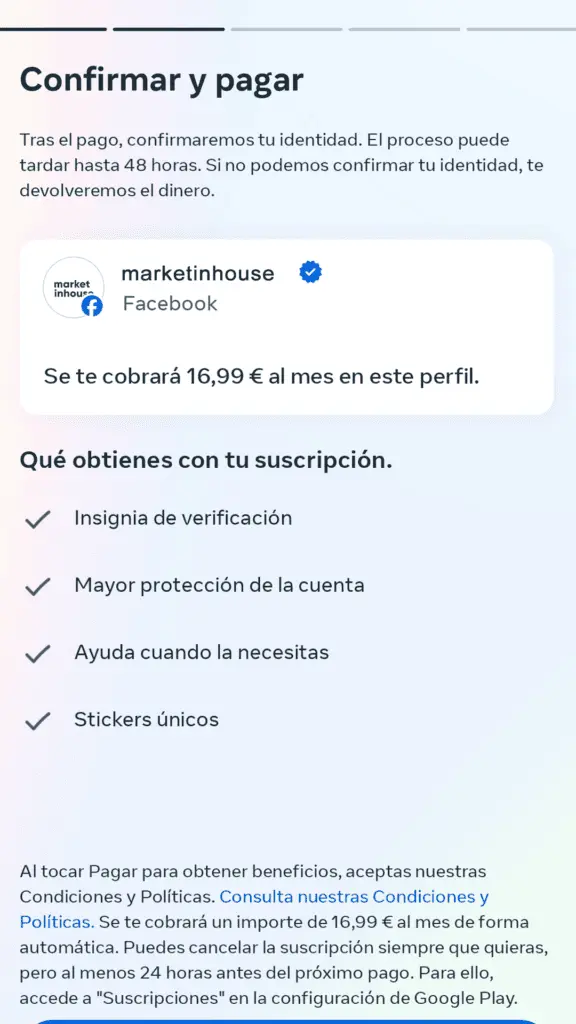 Si lo haces desde la app, tiene un coste de 16,99€ al mes, mientras que si lo haces por la web, el precio es de 13,99€ al mes. Como mínimo, pagarás al año 168€ al año por tener, como atractivo principal, más alcance y notoriedad. Valora si te compensa este coste o asociarlo a estrategias de paid media en redes sociales más ambiciosas.